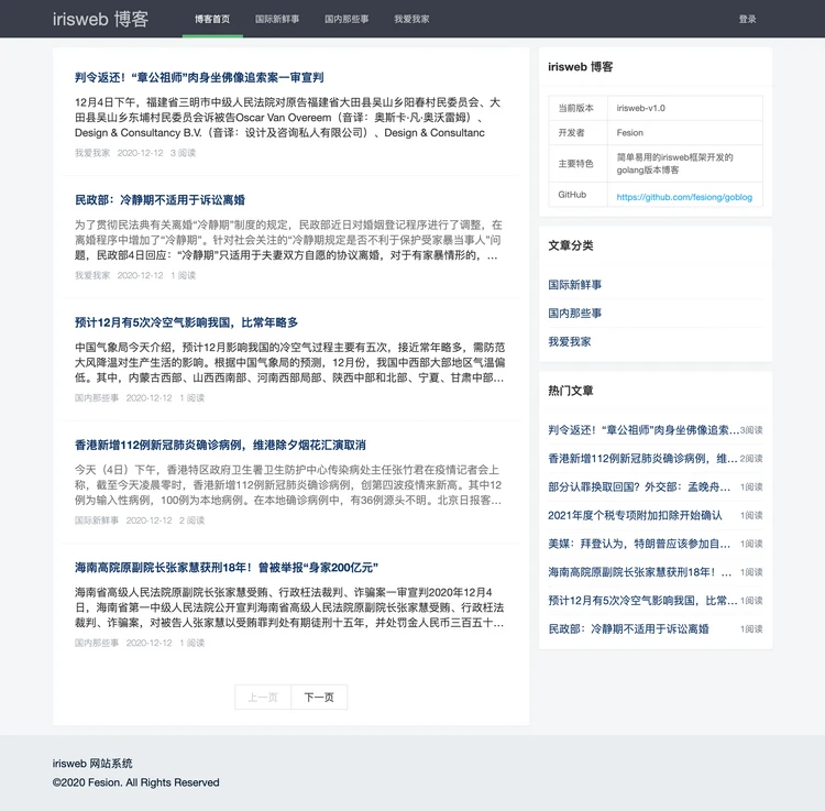 博客首页包含三大块,头部导航、中间主体文章列表内容、页脚信息等。