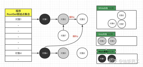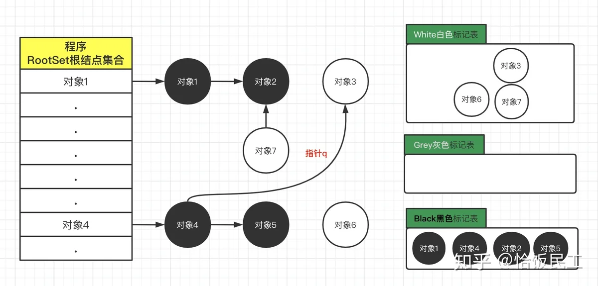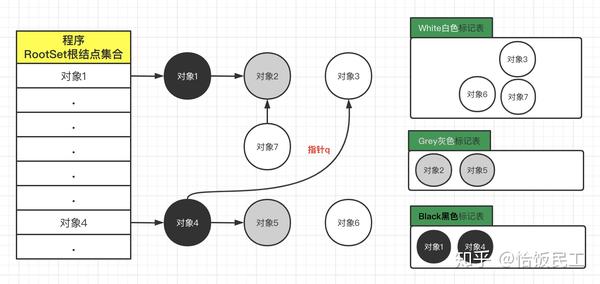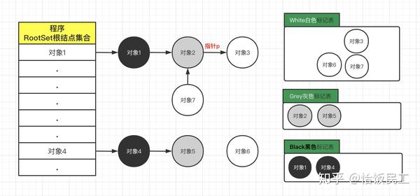规则:黑色对象可以引用白色对象,白色对象存在其他灰色对象对它的引用,或者可达它的链路上游存在灰色对象
