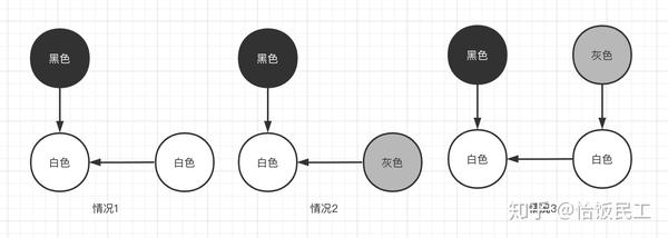 下面的图例可以帮忙理解弱三色不变式。情况1是不被允许,情况2和情况3时被允许的。黑色所引用的白色对象始终会被灰色对象引用,不管是直接引用还是间接引用。