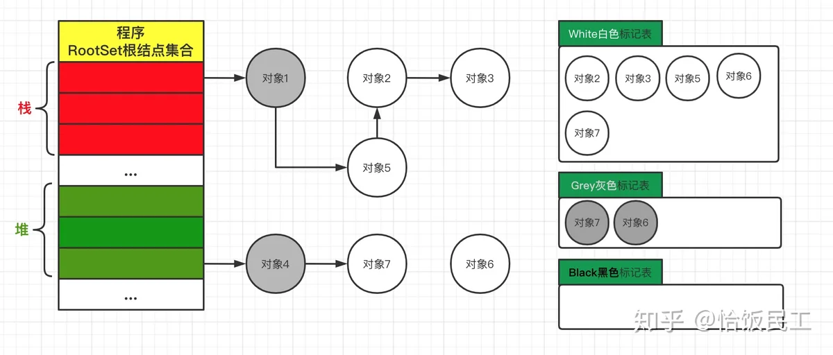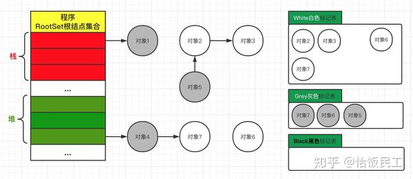 程序创建之初,所有对象都被标记为白色。经过遍历RootSet后,对象1和对象4被标记为灰色。