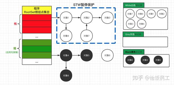 其实,GC在准备清理白色标记的对象前,会重新遍历扫描一次栈空间。这时需要加STW保护栈。具体的操作是:在GC清理前,把栈对象全部标记为白色。如下图: