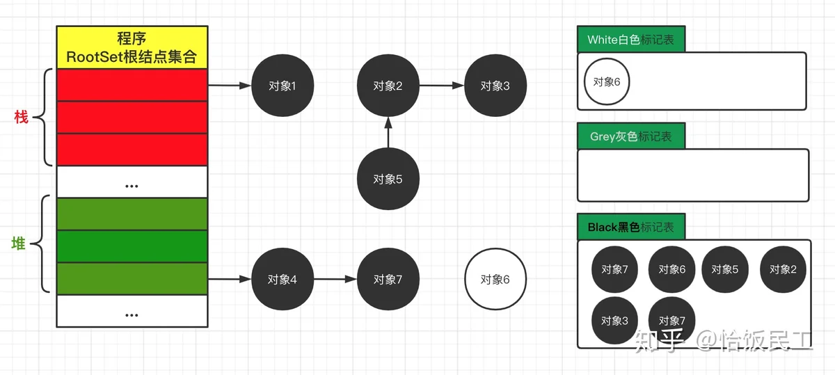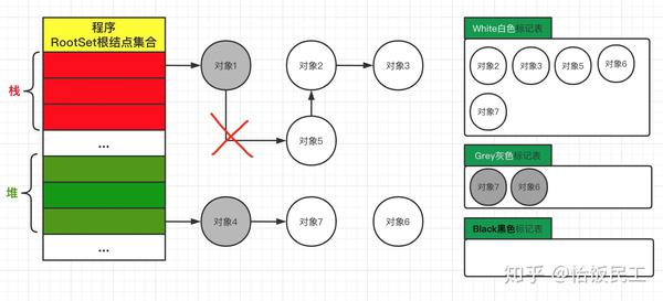 看到最终结果可能不是大家所希望的,对象5已经被对象1删除了,为啥GC不把它清理呢?其实这样做是为了满足弱三色不变式原则,被删除对象都需要标记为灰色,假如对象4此时添加了对象5的引用,那么对象5就会被无辜删除了。那么对象5什么时候被删除呢?答案是等到下一轮GC,对象1肯定到达不了对象5,同时也没有从根节点出发的对象到达对象5,那么对象5就会被合法地删除。