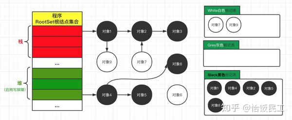 正常继续采用三色标记法,最终结果可用得到对象7和对象9会被清理,其余对象得到保留。这种结果显然不是我们想要的,因为栈中的对象9被对象1所引用,不能被清理。