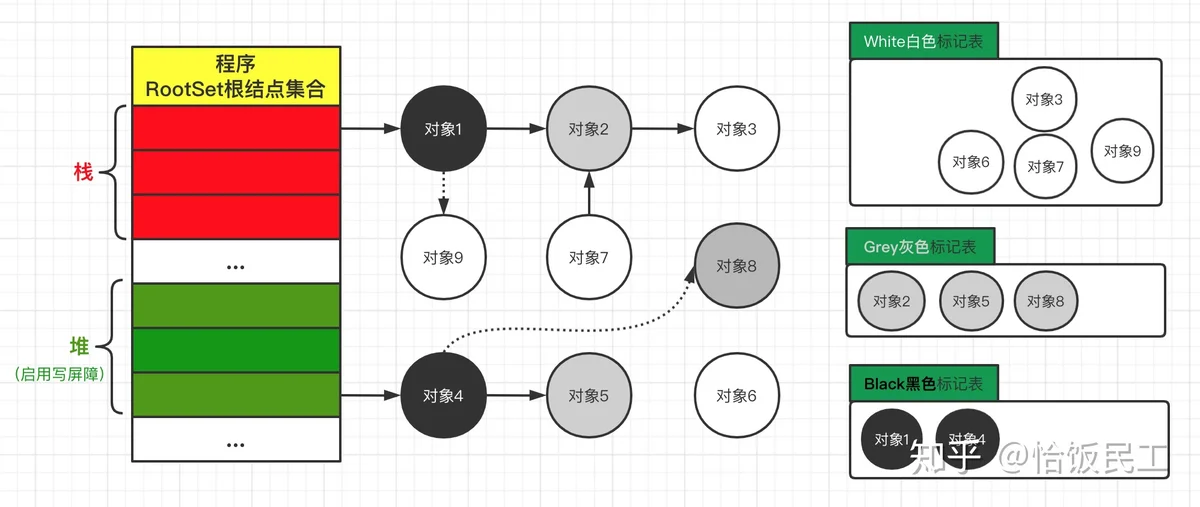 我们可以看到删除写屏障的不足:回收精度低,一个对象即使被删除了最后一个指向它的指针,也依然可以活一轮GC,在下一轮GC中才被清除。