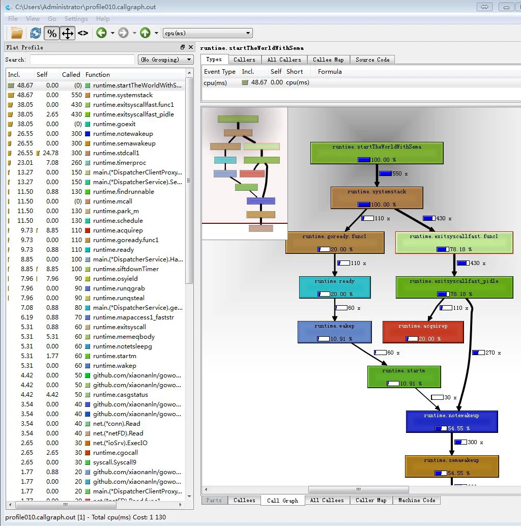 然后使用下载的qcachegrind.exe打开生成的文件即可,此处为:profile010.callgraph.out。使用qcachegrind可以在各个函数之间自由跳转,查看函数内部的CPU占用情况,相对其他格式要更加灵活方便。例如以下是我们对GoWorld游戏服务器进行一次性能测试的结果。