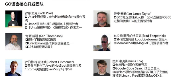 - Go语言是UNIX作者、C语言作者、谷歌V8引擎作者携手打造的, 由谷歌公司2009年推出的一门高级编程言语。