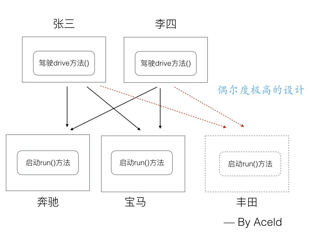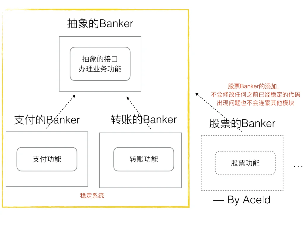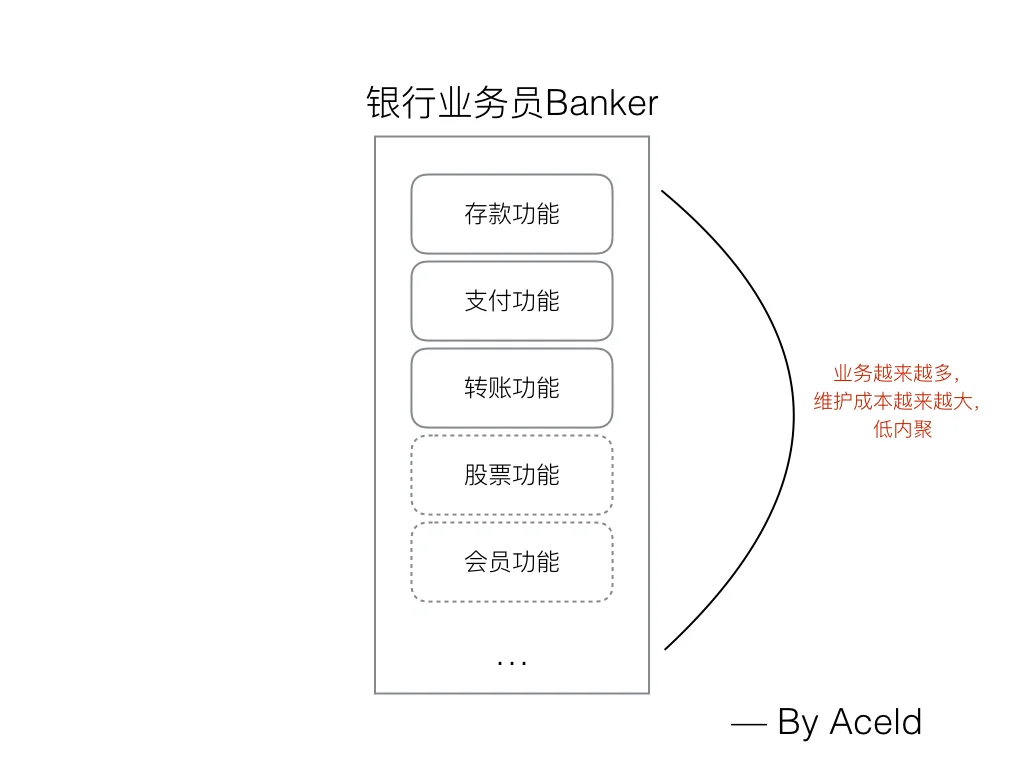 这样的设计会导致,当我们去给Banker添加新的业务的时候,会直接修改原有的Banker代码,那么Banker模块的功能会越来越多,出现问题的几率也就越来越大,假如此时Banker已经有99个业务了,现在我们要添加第100个业务,可能由于一次的不小心,导致之前99个业务也一起崩溃,因为所有的业务都在一个Banker类里,他们的耦合度太高,Banker的职责也不够单一,代码的维护成本随着业务的复杂正比成倍增大。