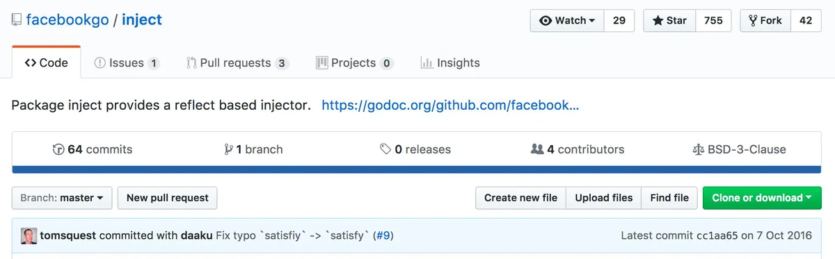 好,接下来我们说说facebookgo团队开源的这个Inject框架如何使用。我们还使用上面的例子,用golang 改写一下。
