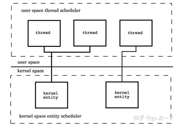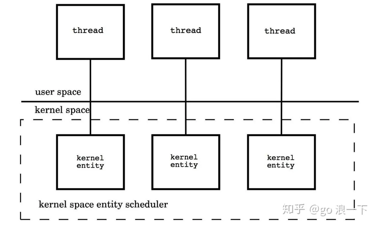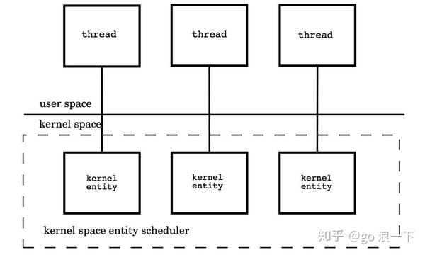 用户线程与KSE是1对1关系(1:1)。大部分编程语言的线程库(如linux的pthread,Java的java.lang.Thread,C++11的std::thread等等)都是对操作系统的线程(内核级线程)的一层封装,创建出来的每个线程与一个不同的KSE静态关联,因此其调度完全由OS调度器来做。这种方式实现简单,直接借助OS提供的线程能力,并且不同用户线程之间一般也不会相互影响。但其创建,销毁以及多个线程之间的上下文切换等操作都是直接由OS层面亲自来做,在需要使用大量线程的场景下对OS的性能影响会很大。