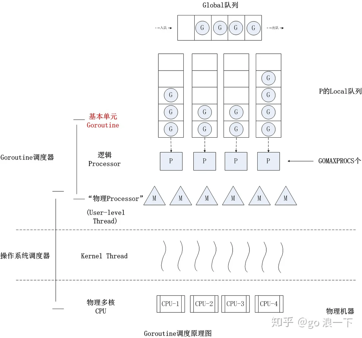 可以看到Go的并发用起来非常简单,用了一个语法糖将内部复杂的实现结结实实的包装了起来。其内部可以用下面这张图来概述: