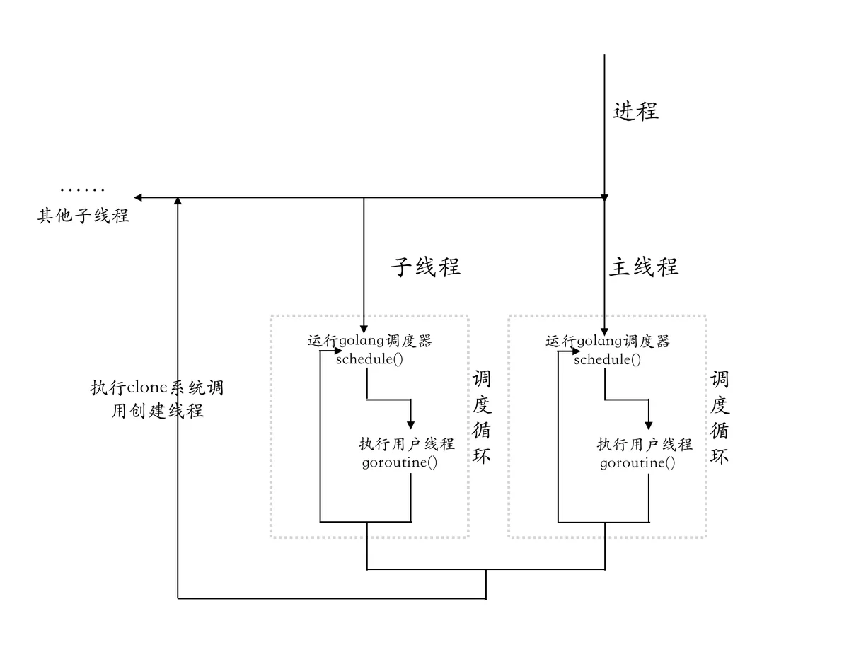 Golang 程序启动时首先会创建进程,然后创建主线程,主线程会执行 runtime 初始化的一些代码,包括调度器的初始化,然后会启动调度器,调度器会不断寻找需要运行的 goroutine 与内核线程绑定运行。