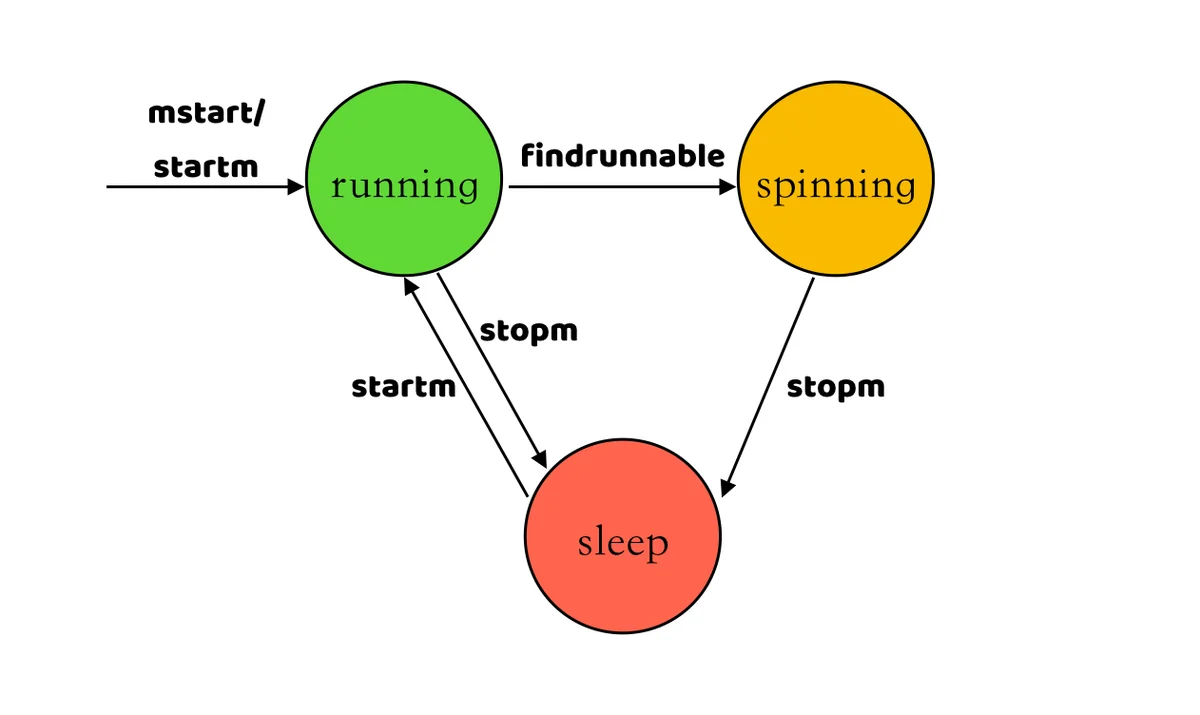 通过 M 的新建和销毁流程的分析,M 有三种状态:运行、自旋、睡眠,这三种状态之间的转换如下所示: