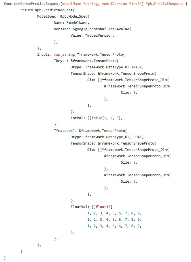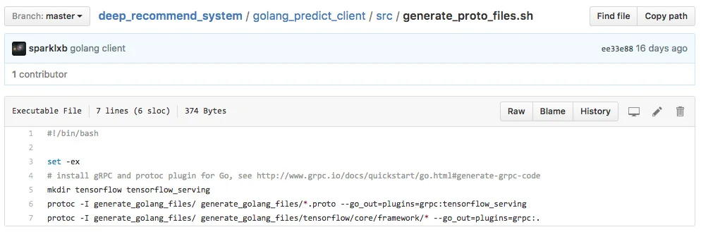 Golang的gRPC客户端代码需要我们自己实现,通过TensorFlow Serving提供的model.proto、predict.proto和prediction_service.proto来生成protobuf和gRPC文件,而它还依赖TensorFlow项目中的TensorProto等proto定义,我们在deep_recommend_system项目中也提供了一个Shell脚本来生成。