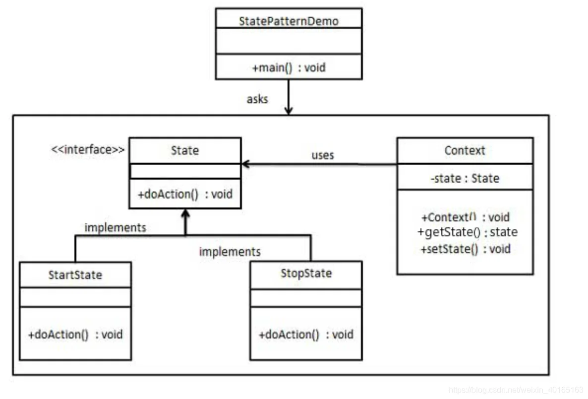 StatePatternDemo,我们的演示类使用Context和状态对象来演示Context在状态改变时的行为变化。