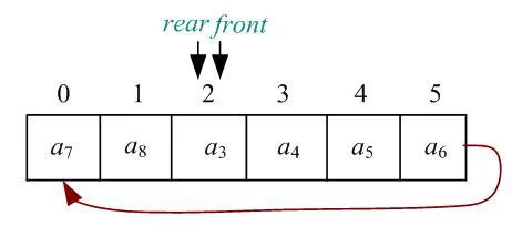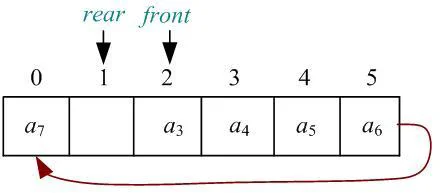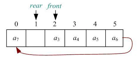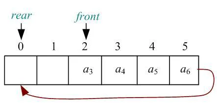 上面第(7)步元素a6进队之后,尾指针Q.rear要后移一个位置,此时已经超过了数组的下标,即Q.rear+1=Maxsize(最大空间数6),那么如果前面有空闲,Q.rear可以转向前面0的位置,如图所示: