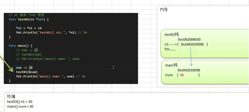 3) 如果希望函数内的变量能修改函数外的变量,可以传入变量的地址&,函数内以指针的方式操 作变量。从效果上看类似引用 。这个案例在前面详解函数使用注意事项的