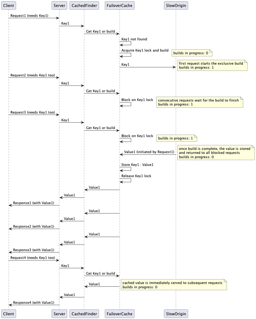 更好的方式是对每个键的构建单独加锁,这样某个调用者就可以获取锁并执行构建,其他调用者则等待构建好的值即可。