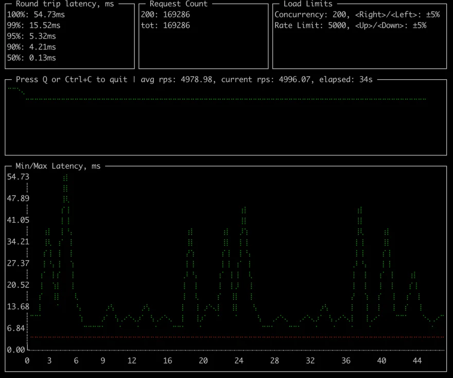 上述命令会启动一个client,循环发送10000个不同的URLs,每秒发送5000个请求,最大并发数为200。每个URL会以100个请求为批次将进行发送,用以模仿单个资源的并发,下面展示了实时数据: