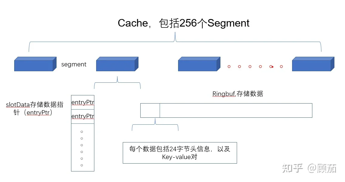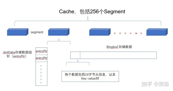 一个segment包含256个槽(slots),每个槽包含一个指向数据(entry)的指针数组。仔细看每个segment包含一个ringbuf,这是存储实体数据的字段。slotsData则是存储数据的指针。其他的都是些辅助统计字段。