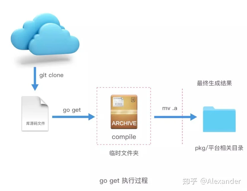这里可以很明显的看到,执行完 go get 命令以后,会调用 git clone 方法下载源码,并编译,最终会把库源码文件编译成归档文件安装到 pkg 对应的相关平台目录下。