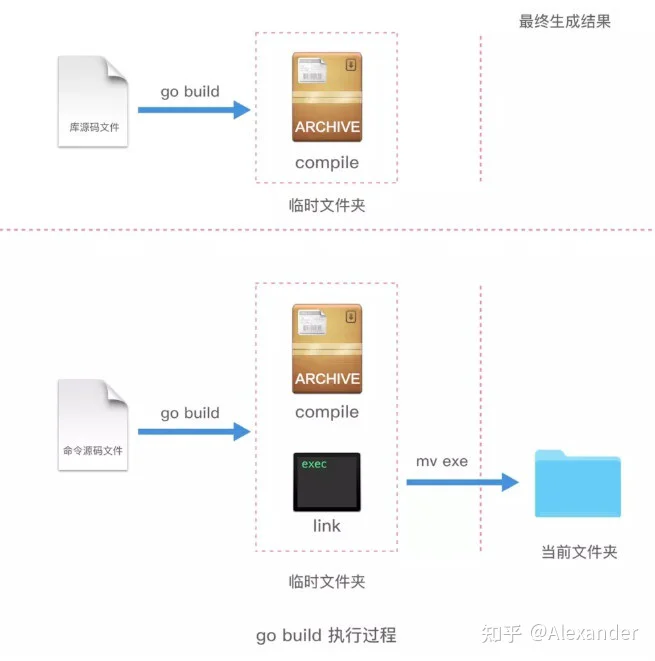 可以看到,执行过程和 go run 大体相同,唯一不同的就是在最后一步,go run 是执行了可执行文件,但是 go build 命令,只是把库源码文件编译了一遍,然后把可执行文件移动到了当前目录的文件夹中。