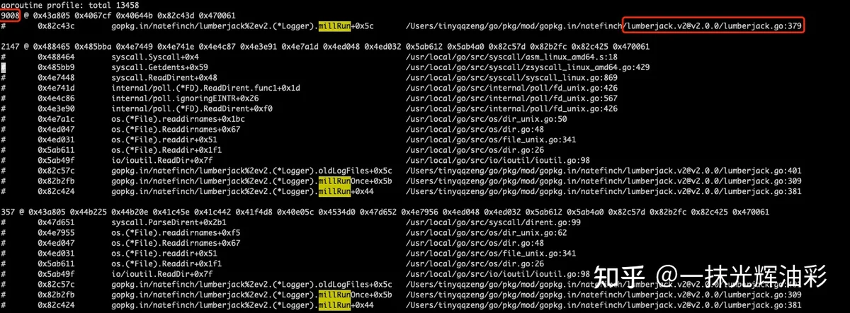 基本定位问题原因后,想进一步弄清楚程序直接依赖的日志库 zap 如何调用底层的 lumberjack 日志切割库导致应用程序 goroutine 泄漏的。