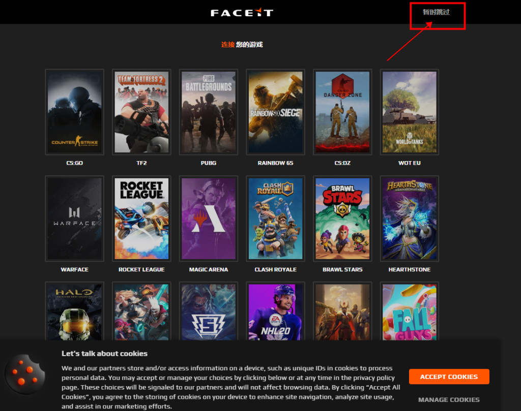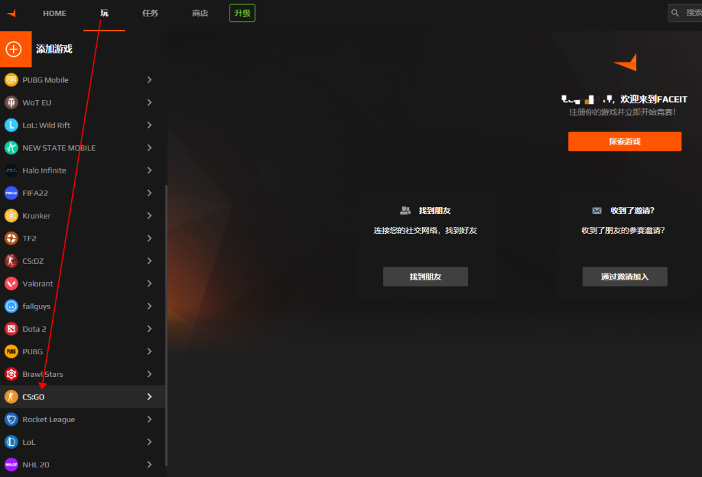 1、当前客户端可能无法绑定,建议通过官网绑定。进入FACEIT官网,在【玩】中选中CS:GO。