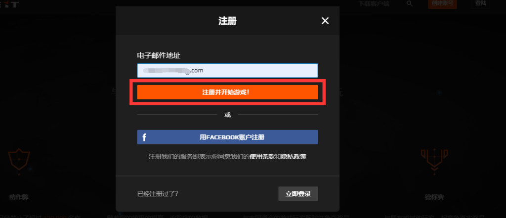 2、输入电子邮箱地址,点击注册并开始游戏。