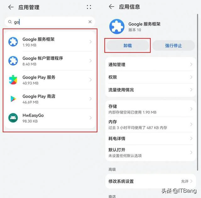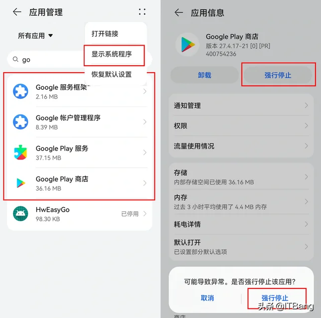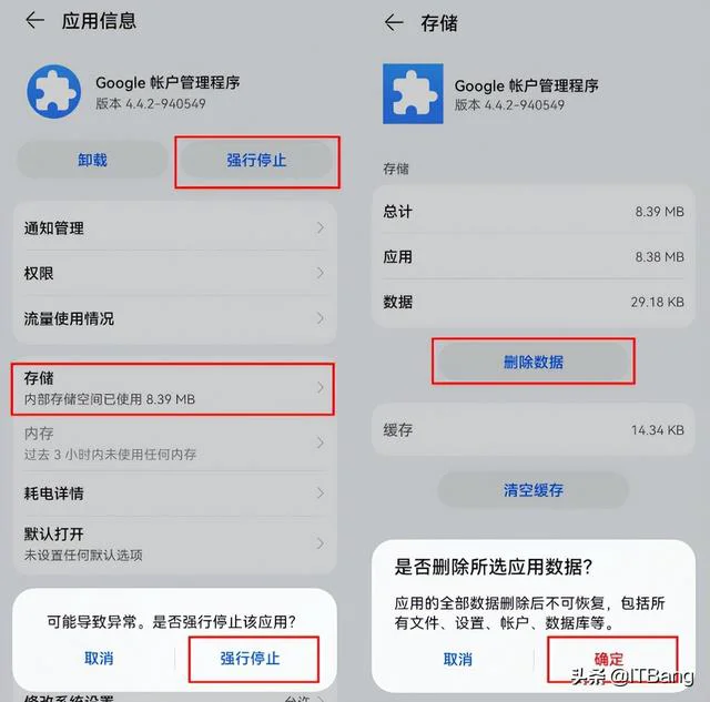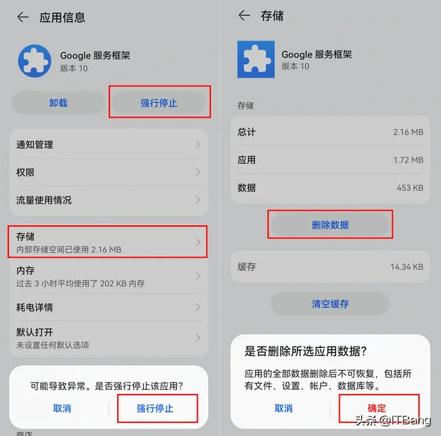9.打开设置-应用和服务-应用管理,强行停止Google Play 商店,强行停止Google 服务框架并删除数据,强行停止Google 账户管理程序并清除数据。
