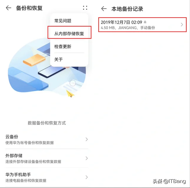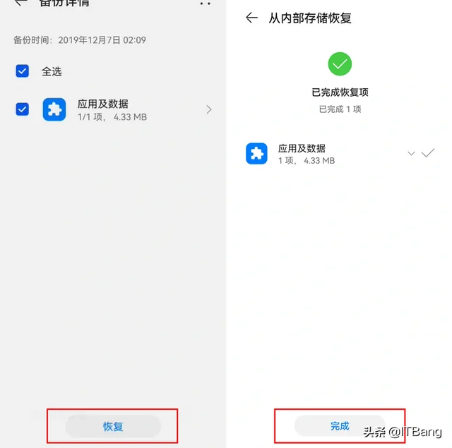 4.点击右上角-从内部存储恢复,选择备份,选中恢复,查看提示输入密码,密码为a12345678,恢复后点击完成。