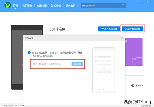 6.打开电脑上的华为手机助手,并通过USB线连接手机,弹出是否允许USB调试点击确定,然后会自动跳转到华为手机助手,点击始终允许授权,然后输入验证码连接到电脑。