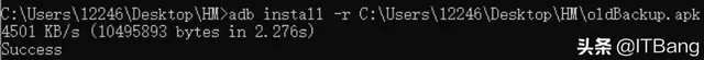 9.然后再输入adb install -r -d C:\(自己电脑文件的位置)\HM\oldBackup.apk,回车,出现下图则代表成功。(如还是不成功,可以去应用市场-安装管理,卸载备份软件)