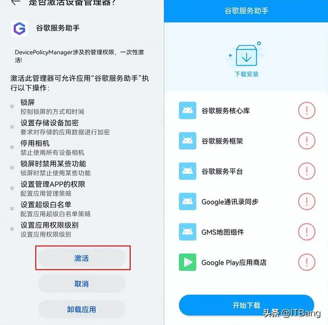 5.返回桌面点击谷歌服务助手,选择始终允许,然后点击激活就完成了,不用点击开始下载。
