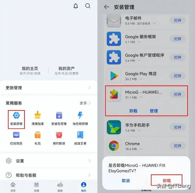 6.安装完成后打开手机应用市场-我的-安装管理,找到谷歌登录器进行卸载。