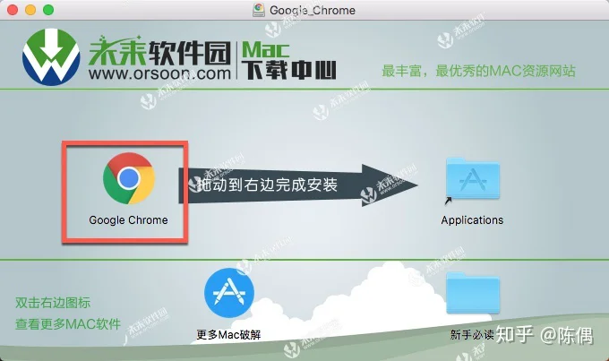 1.下载好软件包双击点开出现如下图,之后点击【Google Chrome】拖到右边的应用程序,即可安装成功,感谢您对未来软件园的支持!