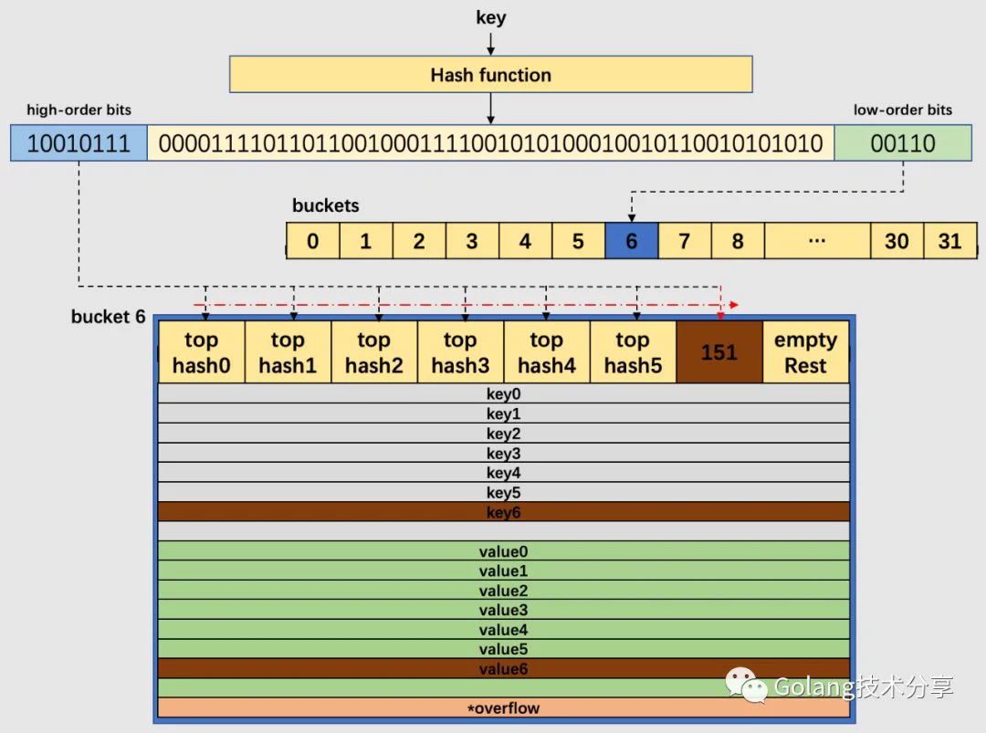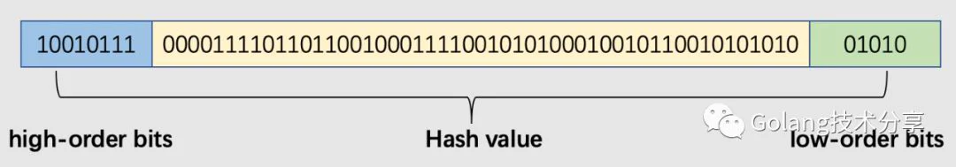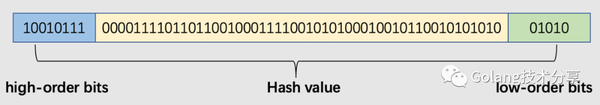 map中的数据被存放于一个数组中的,数组的元素是桶(bucket),每个桶至多包含8个键值对数据。哈希值低位(low-order bits)用于选择桶,哈希值高位(high-order bits)用于在一个独立的桶中区别出键。哈希值高低位示意图如下