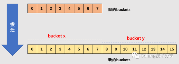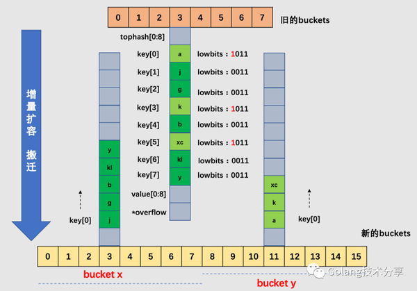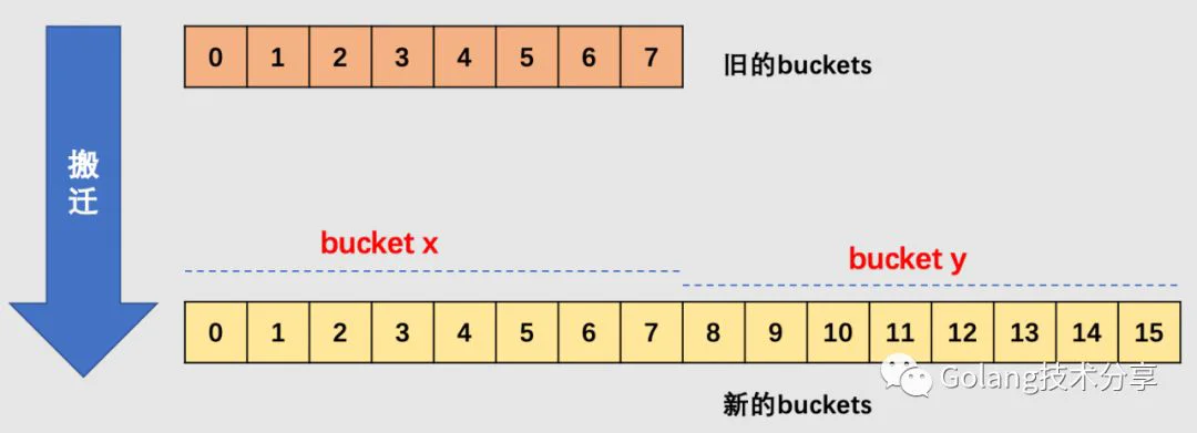 在源码中,有bucket x 和bucket y的概念,其实就是增量扩容到原来的 2 倍,桶的数量是原来的 2 倍,前一半桶被称为bucket x,后一半桶被称为bucket y。一个 bucket 中的 key 可能会分裂到两个桶中去,分别位于bucket x的桶,或bucket y中的桶。所以在搬迁一个 cell 之前,需要知道这个 cell 中的 key 是落到哪个区间(而对于同一个桶而言,搬迁到bucket x和bucket y桶序号的差别是老的buckets大小,即2^old_B)。