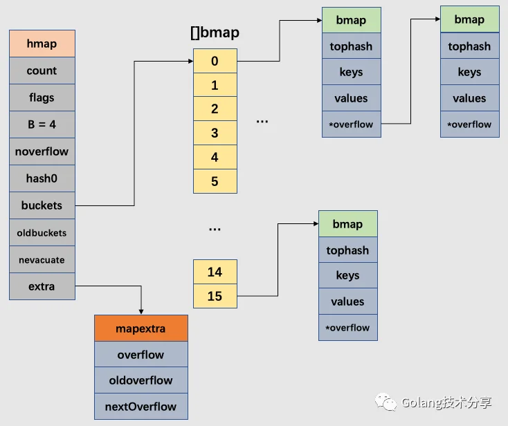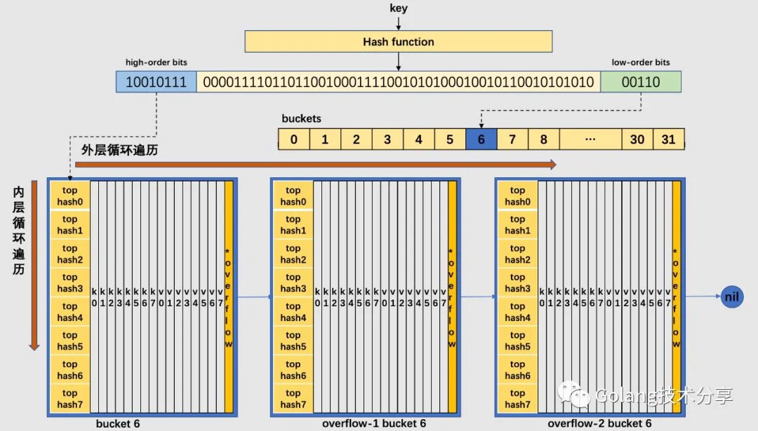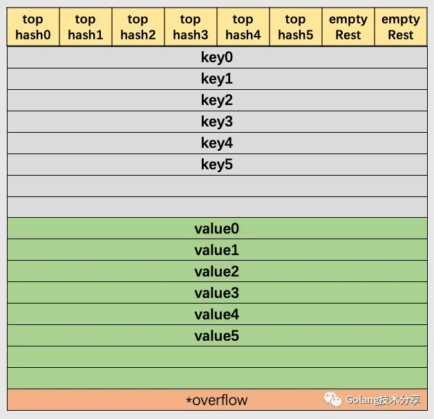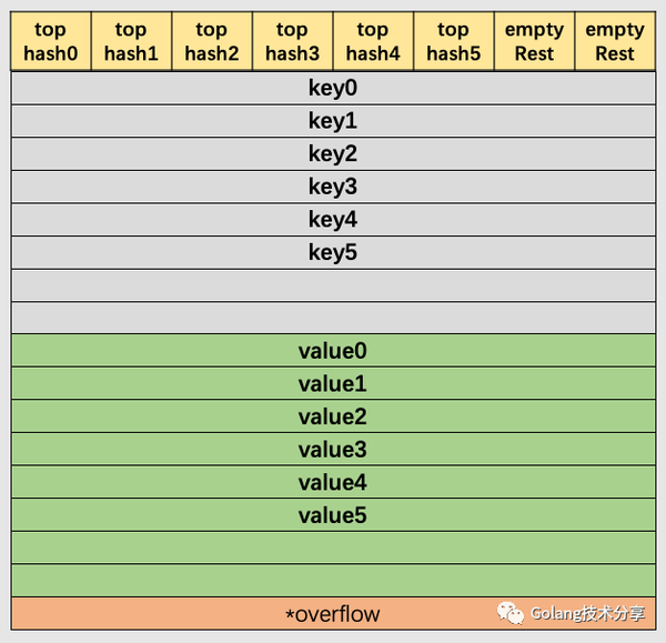 在以上图解示例中,该桶的第7位cell和第8位cell还未有对应键值对。需要注意的是,key和value是各自存储起来的,并非想象中的key/value/key/value...的形式。这样做虽然会让代码组织稍显复杂,但是它的好处是能让我们消除例如map[int64]int所需要的填充(padding)。此外,在8个键值对数据后面有一个overflow指针,因为桶中最多只能装8个键值对,如果有多余的键值对落到了当前桶,那么就需要再构建一个桶(称为溢出桶),通过overflow指针链接起来。