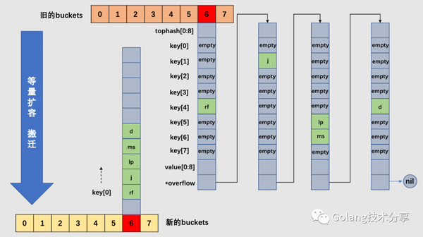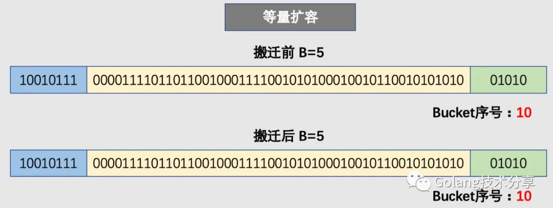 前面讲到,增量扩容(条件1)和等量扩容(条件2)都需要进行bucket的搬迁工作。对于等量扩容而言,由于buckets的数量不变,因此可以按照序号来搬迁。例如老的的0号bucket,仍然搬至新的0号bucket中。