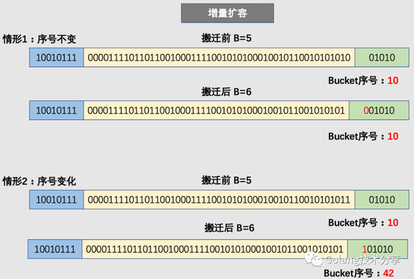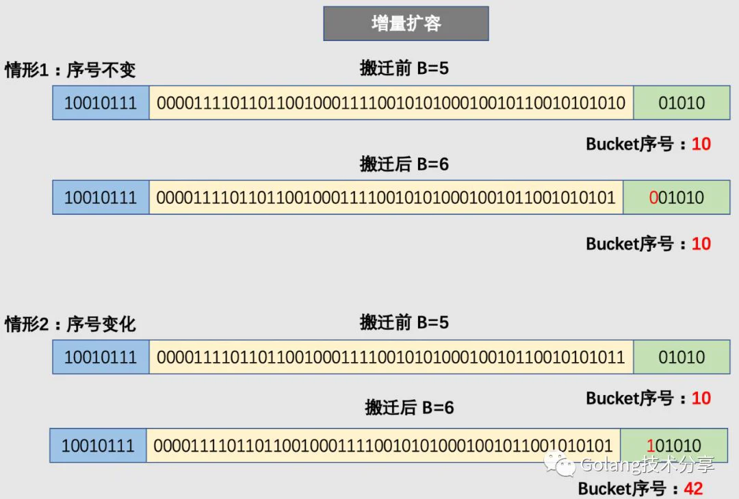 因此,在增量扩容中,某个 key 在搬迁前后 bucket 序号可能和原来相等,也可能是相比原来加上 2^B(原来的 B 值),取决于低 hash 值第倒数第B+1位是 0 还是 1。