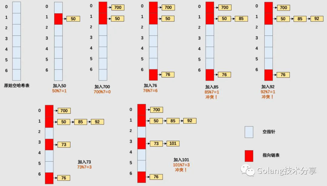 下面以一个简单的哈希函数 H(key) = key MOD 7(除数取余法)对一组元素 [50, 700, 76, 85, 92, 73, 101] 进行映射,通过图示来理解链地址法处理Hash冲突的处理逻辑。