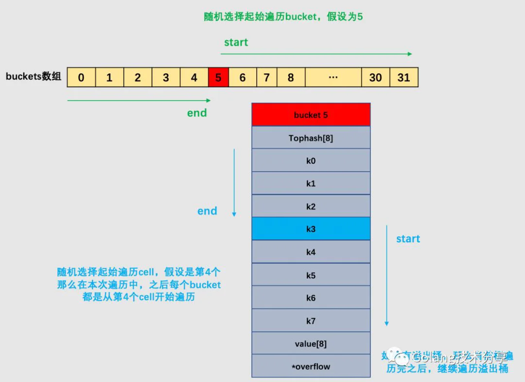 但其实,go为了保证遍历map的结果是无序的,做了以下事情:map在遍历时,并不是从固定的0号bucket开始遍历的,每次遍历,都会从一个随机值序号的bucket,再从其中随机的cell开始遍历。然后再按照桶序遍历下去,直到回到起始桶结束。