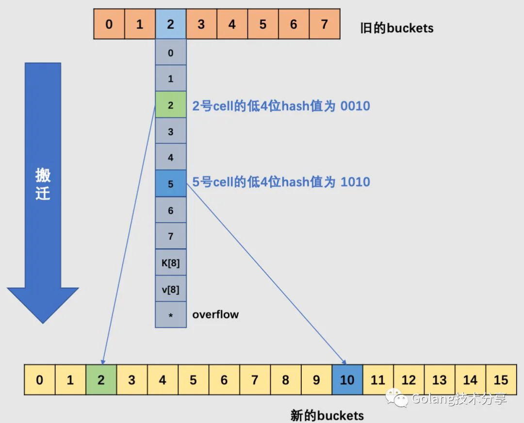 如上图所示,当原始的B = 3时,旧buckets数组长度为8,在编号为2的bucket中,其2号cell和5号cell,它们的低3位哈希值相同(不相同的话,也就不会落在同一个桶中了),但是它们的低4位分别是0010、1010。当发生了增量扩容,2号就会被搬迁到新buckets数组的2号bucket中去,5号被搬迁到新buckets数组的10号bucket中去,它们的桶号差距是2的3次方。