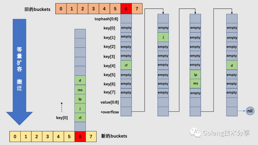 以6号桶为例,它有一个bucket和3个overflow buckets,但是我们能够发现桶里的数据非常稀疏,等量扩容的目的就是为了把松散的键值对重新排列一次,以使bucket的使用率更高,进而保证更快的存取。搬迁完毕后,新的6号桶中只有一个基础bucket,暂时并不需要溢出桶。这样,和原6号桶相比,数据变得紧密,使后续的数据存取变快。
