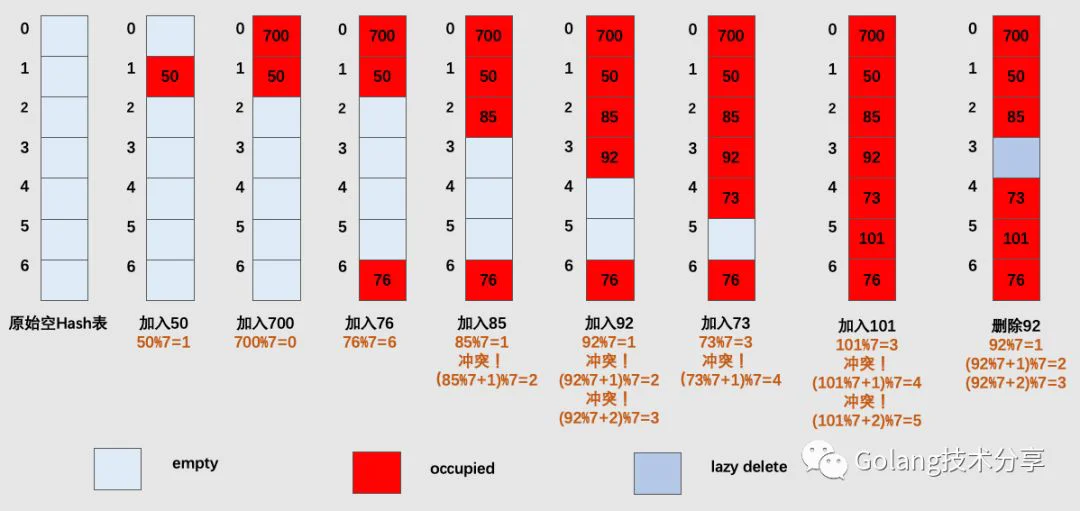 其中,empty代表槽位为空,occupied代表槽位已被占(后续映射到该槽,则需要线性向下继续探测),而lazy delete则代表将槽位里面的数据清除,并不释放存储空间。
