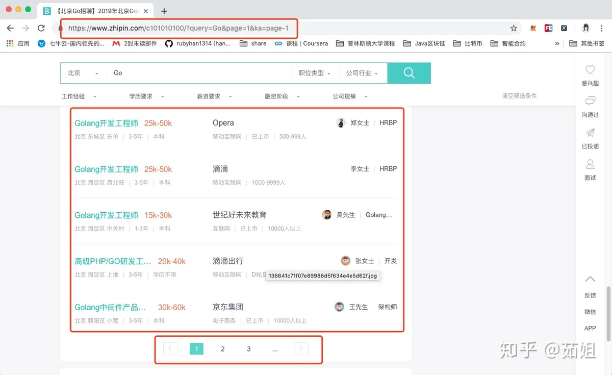 然后我们可以看到一个列表,和Go语言相关的各种招聘职位,还可以不停的下一页。。
