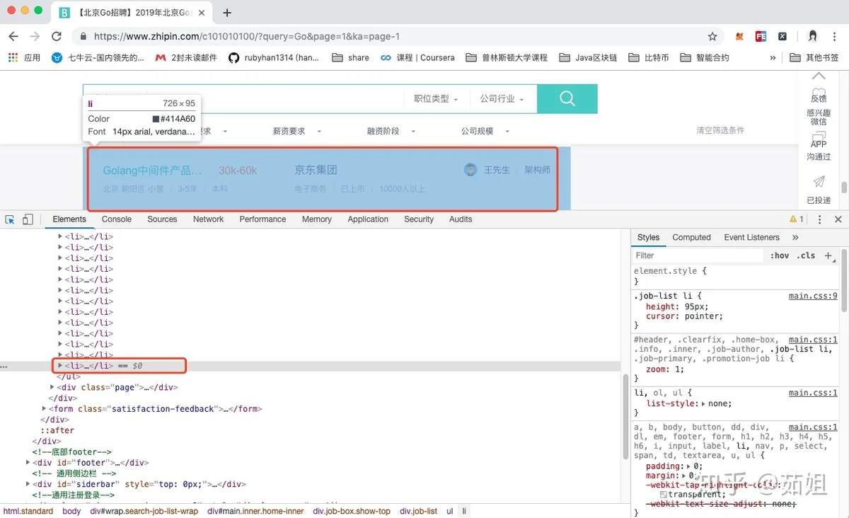 我们通过分析页面的结构发现,页面的职位列表,其实都位于一个ul中的li里,每个页面有30个职位,所以有30个li标签:
