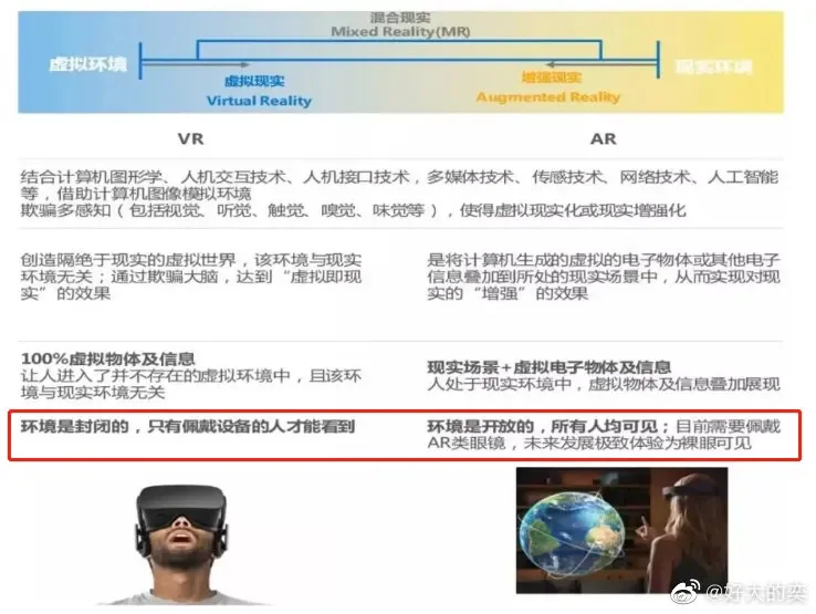 而VR呢,呈现给用户的仅仅是虚拟世界,所以你也可理解为: