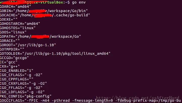 第一行是我自己配置的golang的工作目录,根据每个人而异,下面两行相同。输入完后保存关闭,然后输入命令: source ~/.bashrc 使环境变量生效。我们可以输入命令 go env来查看我们配置好的环境变量: