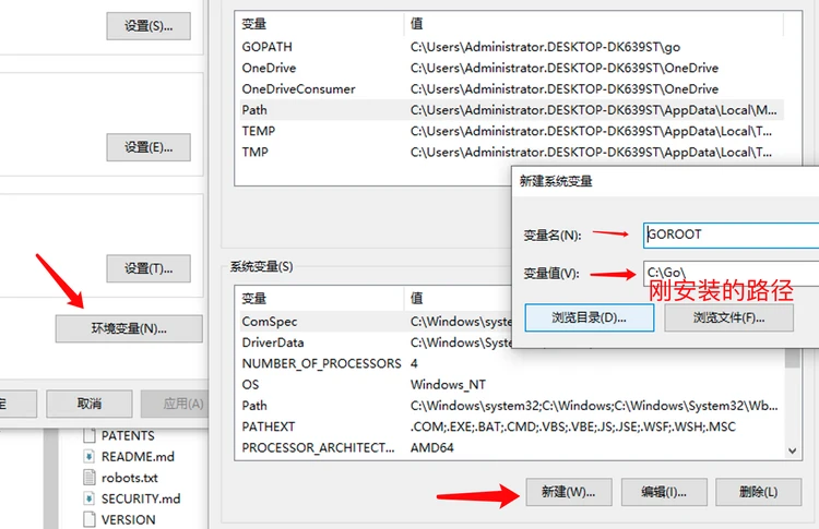 在弹出的待花开终,选择“高级”标签,点击环境变量按钮,在弹出的变量设置窗口中,在系统变量下方点新建按钮,添加GOROOT变量,变量值是上面安装的路径:C:\Go\。